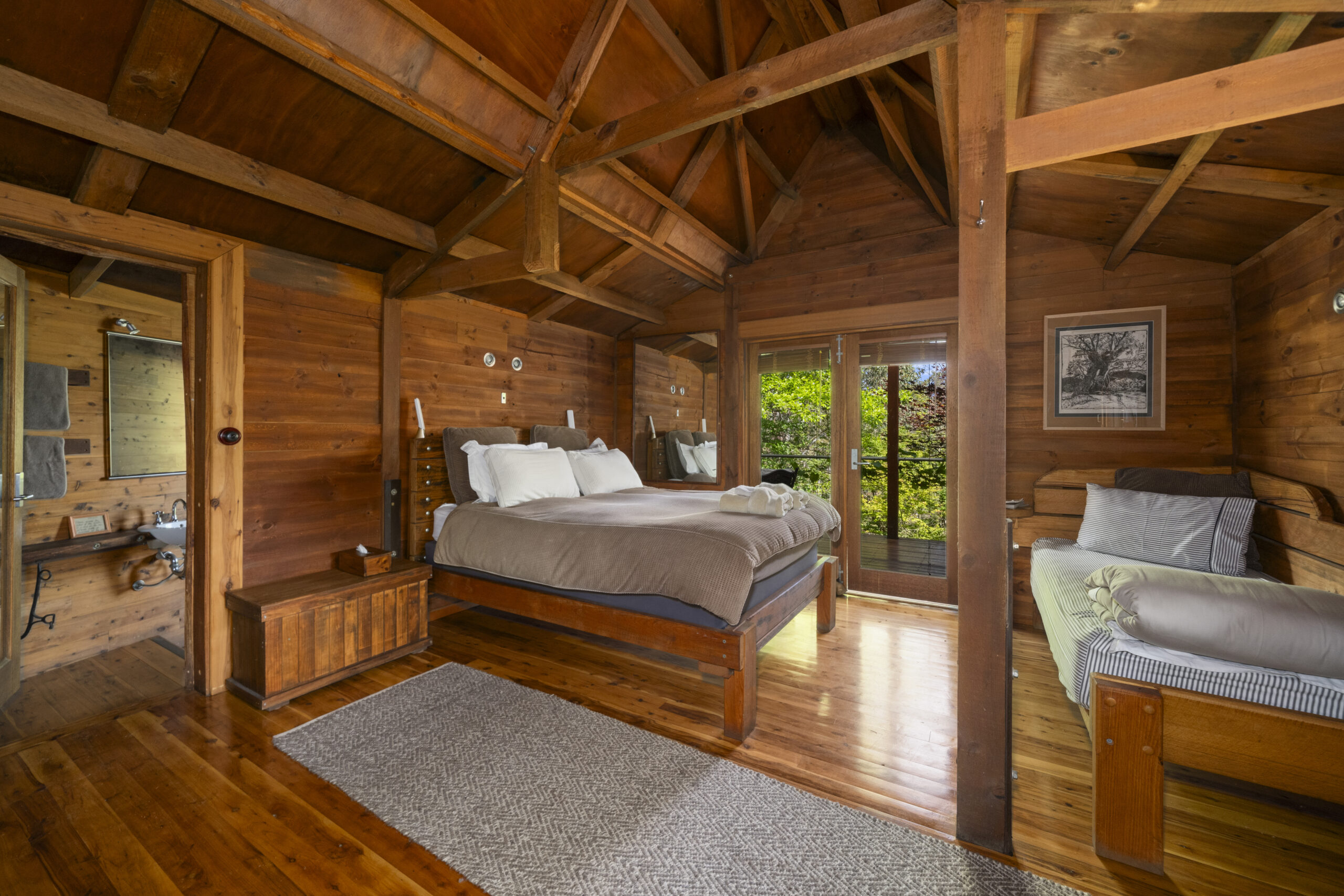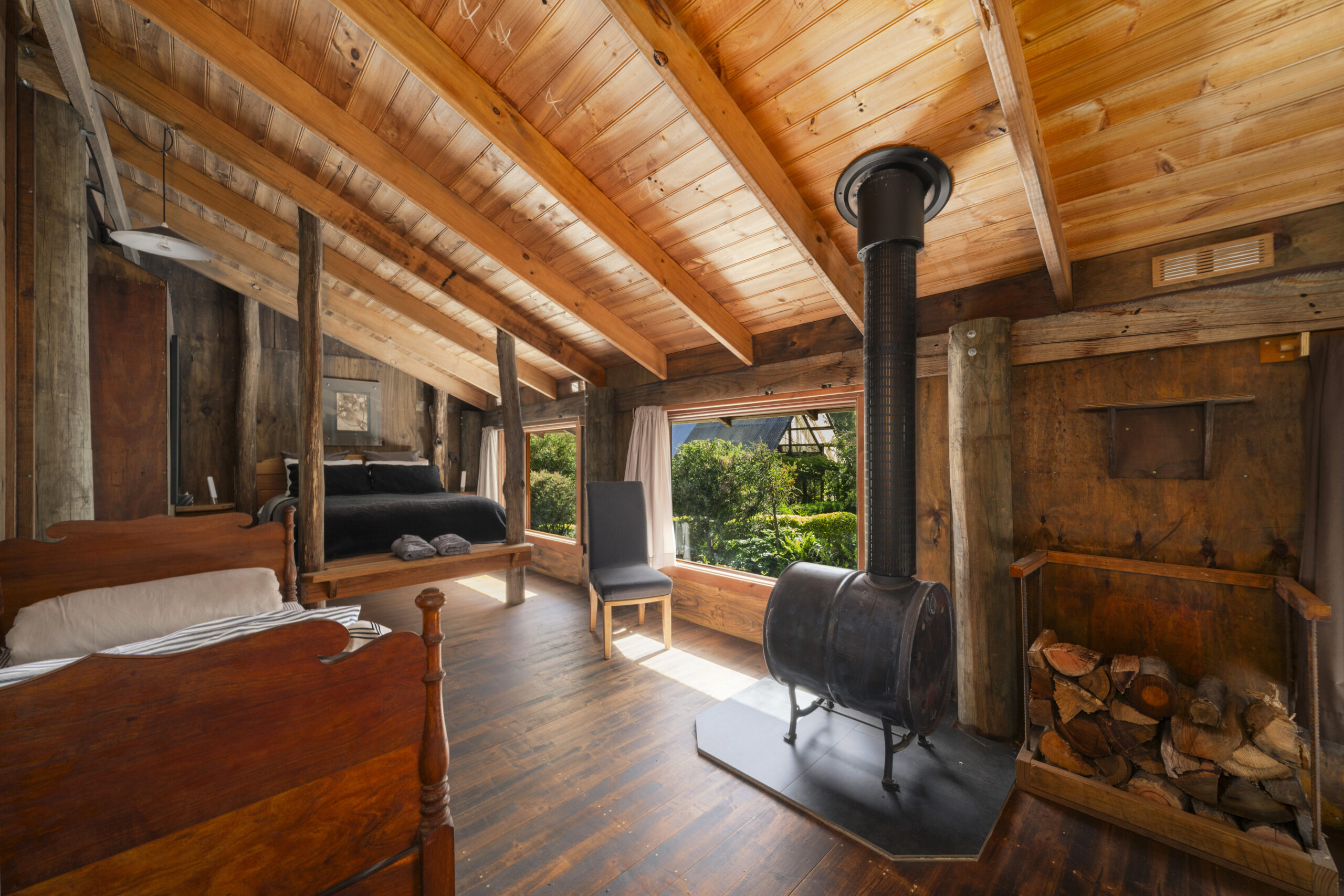 Two expansive areas known as the East and West Wing, are on either side of a large, warm dining room. Each Wing has a queen-size four-poster bush bed made by Grae using local timbers. A day bed, sitting area, warming wood fire heater (especially important on those cold nights!) ensuite and crisp linen.